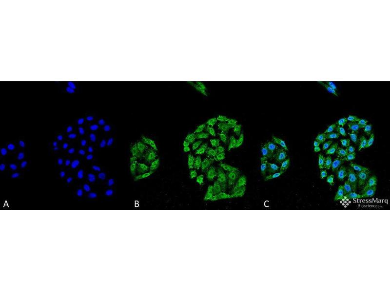 - HSP70 genes encode abundant heat-inducible 70- kDa HSPs (HSP70s). In most eukaryotes HSP70 genes exist as part of a multigene family. They are found in most cellular compartments of eukaryotes including nuclei, mitochondria, chloroplasts, the endoplasmic reticulum and the cytosol, as well as in bacteria. The genes show a high degree of conservation, having at least 50 % identity (2). The N-terminal two thirds of HSP70s are more conserved than the C-terminal third. HSP70 binds ATP with high affinity and possesses a weak ATPase activity which can be stimulated by binding to unfolded proteins and synthetic peptides (3). When HSC70 (constitutively expressed) present in mammalian cells was truncated, ATP binding activity was found to reside in an N-terminal fragment of 44 kDa which lacked peptide binding capacity. Polypeptide binding ability therefore resided within the C-terminal half (4). The structure of this ATP binding domain displays multiple features of nucleotide binding proteins (5). All HSP70s, regardless of location, bind proteins, particularly unfolded ones. The molecular chaperones of the HSP70 family recognize and bind to nascent polypeptide chains as well as partially folded intermediates of proteins preventing their aggregation and misfolding. The binding of ATP triggers a critical conformational change leading to the release of the bound substrate protein (6). The universal ability of HSP70s to undergo cycles of binding to and release from hydrophobic stretches of partially unfolded proteins determines their role in a great variety of vital intracellular functions such as protein synthesis, protein folding and oligomerization and protein transport. For more information visit our HSP70 Scientific Resource Guide at http://www.HSP70.com.