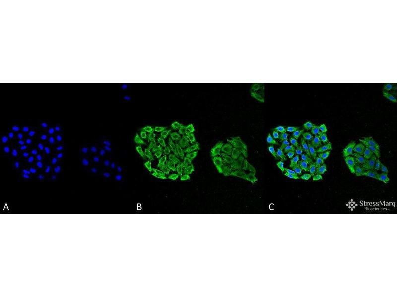 HSP70 genes encode abundant heat-inducible 70- kDa HSPs (HSP70s). In most eukaryotes HSP70 genes exist as part of a multigene family. They are found in most cellular compartments of eukaryotes including nuclei, mitochondria, chloroplasts, the endoplasmic reticulum and the cytosol, as well as in bacteria. The genes show a high degree of conservation, having at least 50 % identity (1). The N-terminal two thirds of HSP70s are more conserved than the C-terminal third. HSP70 binds ATP with high affinity and possesses a weak ATPase activity which can be stimulated by binding to unfolded proteins and synthetic peptides (2). When HSC70 (constitutively expressed) present in mammalian cells was truncated, ATP binding activity was found to reside in an N-terminal fragment of 44 kDa which lacked peptide binding capacity. Polypeptide binding ability therefore resided within the C-terminal half (3). The structure of this ATP binding domain displays multiple features of nucleotide binding proteins (4). All HSP70s, regardless of location, bind proteins, particularly unfolded ones. The molecular chaperones of the HSP70 family recognize and bind to nascent polypeptide chains as well as partially folded intermediates of proteins preventing their aggregation and misfolding. The binding of ATP triggers a critical conformational change leading to the release of the bound substrate protein (5). The universal ability of HSP70s to undergo cycles of binding to and release from hydrophobic stretches of partially unfolded proteins determines their role in a great variety of vital intracellular functions such as protein synthesis, protein folding and oligomerization and protein transport. For more information visit our HSP70 Scientific Resource Guide at http://www.HSP70.com.