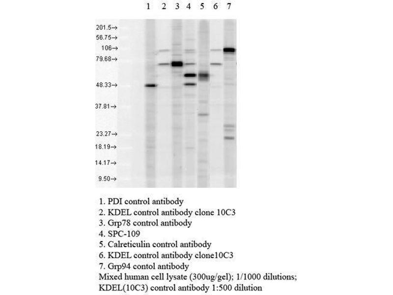 - Detects KDEL proteins, GRP94, Grp78, PDI and calreticulin. It may also see ERp57 and ERp29.