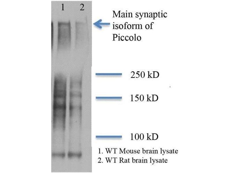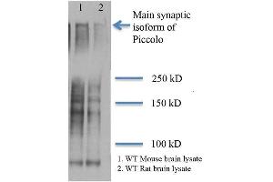1 μg/ml of ABIN2482372 was sufficient for detection of Piccolo in 20 μg of rat brain tissue lysate by colorimetric immunoblot analysis using goat IgG:HRP as the secondary antibody.