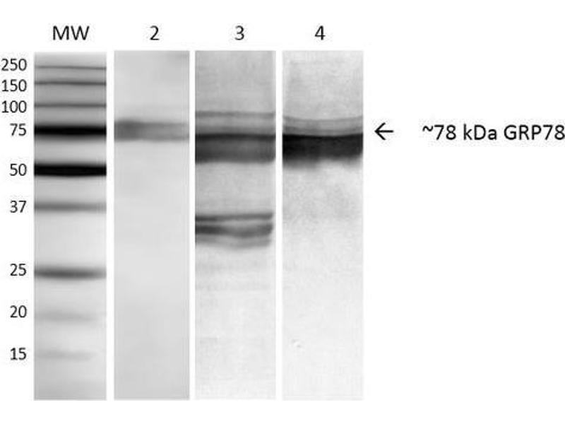 1 μg/ml of ABIN2482405 was sufficient for detection of GRP78 in 20 μg of HEK-293 lysate by colorimetric immunoblot analysis using Goat anti-mouse IgG:HRP as the secondary antibody.