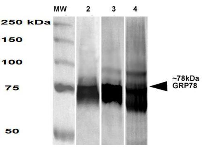 1 μg/ml of ABIN2482423 was sufficient for detection of GRP78 in 20 μg of HEK-293 lysate by colorimetric immunoblot analysis using Goat anti-mouse IgG:HRP as the secondary antibody.