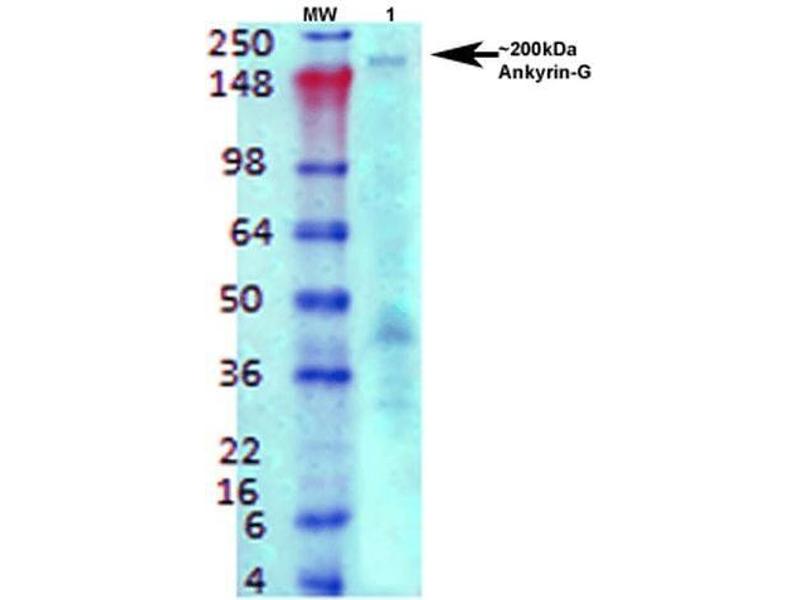 1 μg/ml of ABIN2482470 was sufficient for detection of Ankyrin-G in 20 μg of rat brain membrane lysate and assayed by colorimetric immunoblot analysis using goat anti-mouse IgG:HRP as the secondary antibody.
