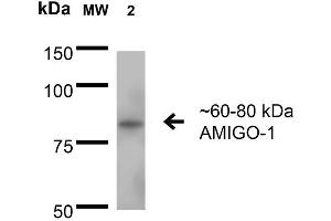 1 μg/ml of ABIN2483804 was sufficient for detection of AMIGO-1 in 20 μg of rat brain membrane lysate and assayed by colorimetric immunoblot analysis using goat anti-mouse IgG:HRP as the secondary antibody.