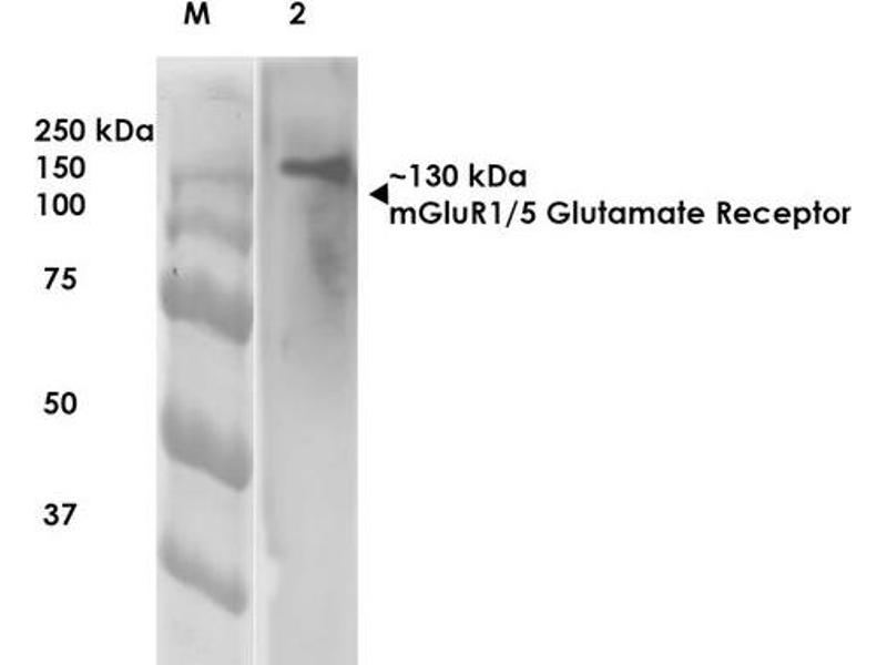 - Detects ~130 kDa (both mGluR1 and mGluR5).
