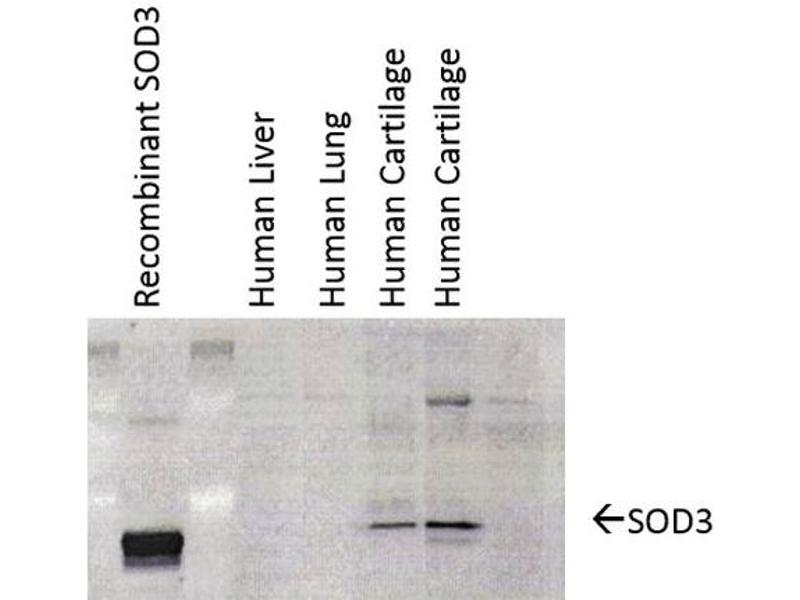 1 μg/ml of ABIN2484271 was sufficient for detection of EC-SOD in 20 μg of human cartilage lysate by colorimetric immunoblot analysis using Goat anti-mouse IgG:HRP as the secondary antibody.
