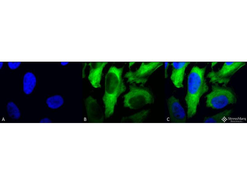 - HSP27s belong to an abundant and ubiquitous family of small heat shock proteins (sHSP). It is an important HSP found in both normal human cells and cancer cells. The basic structure of most sHSPs is a homologous and highly conserved amino acid sequence, with an α-crystallin domain at the C-terminus and the WD/EPF domain at the less conserved N-terminus. This N-terminus is essential for the development of high molecular oligomers (1, 2). HSP27-oligomers consist of stable dimers formed by as many as 8-40 HSP27 protein monomers (3). The oligomerization status is connected with the chaperone activity: aggregates of large oligomers have high chaperone activity, whereas dimers have no chaperone activity (4). HSP27 is localized to the cytoplasm of unstressed cells but can redistribute to the nucleus in response to stress, where it may function to stabilize DNA and/or the nuclear membrane. Other functions include chaperone activity (as mentioned above), thermo tolerance in vivo, inhibition of apoptosis, and signal transduction. Specifically, in vitro, it acts as an ATP-independent chaperone by inhibiting protein aggregation and by stabilizing partially denatured proteins, which ensures refolding of the HSP70 complex. HSP27 is also involved in the apoptotic signaling pathway because it interferes with the activation of cytochrome c/Apaf-1/dATP complex, thereby inhibiting the activation of procaspase-9. It is also hypothesized that HSP27 may serve some role in cross-bridge formation between actin and myosin (5). And finally, HSP27 is also thought to be involved in the process of cell differentiation. The up-regulation of HSP27 correlates with the rate of phosphorylation and with an increase of large oligomers. It is possible that HSP27 may play a crucial role in termination of growth (6). For more information visit our HSP27 Scientific Resource Guide at http://www.HSP27.com.