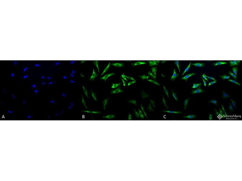 - HSP27s belong to an abundant and ubiquitous family of small heat shock proteins (sHSP). It is an important HSP found in both normal human cells and cancer cells. The basic structure of most sHSPs is a homologous and highly conserved amino acid sequence, with an α-crystallin domain at the C-terminus and the WD/EPF domain at the less conserved N-terminus. This N-terminus is essential for the development of high molecular oligomers (1, 2). HSP27-oligomers consist of stable dimers formed by as many as 8-40 HSP27 protein monomers (3). The oligomerization status is connected with the chaperone activity: aggregates of large oligomers have high chaperone activity, whereas dimers have no chaperone activity (4). HSP27 is localized to the cytoplasm of unstressed cells but can redistribute to the nucleus in response to stress, where it may function to stabilize DNA and/or the nuclear membrane. Other functions include chaperone activity (as mentioned above), thermo tolerance in vivo, inhibition of apoptosis, and signal transduction. Specifically, in vitro, it acts as an ATP-independent chaperone by inhibiting protein aggregation and by stabilizing partially denatured proteins, which ensures refolding of the HSP70 complex. HSP27 is also involved in the apoptotic signaling pathway because it interferes with the activation of cytochrome c/Apaf-1/dATP complex, thereby inhibiting the activation of procaspase-9. It is also hypothesized that HSP27 may serve some role in cross-bridge formation between actin and myosin (5). And finally, HSP27 is also thought to be involved in the process of cell differentiation. The up-regulation of HSP27 correlates with the rate of phosphorylation and with an increase of large oligomers. It is possible that HSP27 may play a crucial role in termination of growth (6). For more information visit our HSP27 Scientific Resource Guide at http://www.HSP27.com.