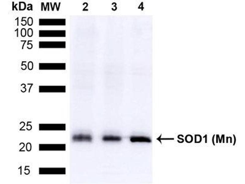 0.2 μg/ml of ABIN2484391 was sufficient for detection of Mn SOD in 20 μg of rat brain tissue extract by colorimetric immunoblot analysis using Goat anti-mouse IgG:AP as the secondary antibody.