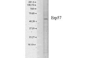 0.5 μg/ml of ABIN2484397 was sufficient for detection of ERp57 in 10 μg of heat shock Heal Lysate by colorimetric immunoblot analysis using Goat anti-mouse IgG:HRP as the secondary antibody.