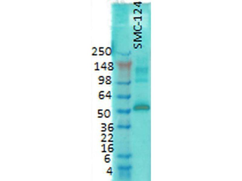 - Detects ~50-60 kDa. Recognizes both phosphorylated and non-phosphorylated forms.
