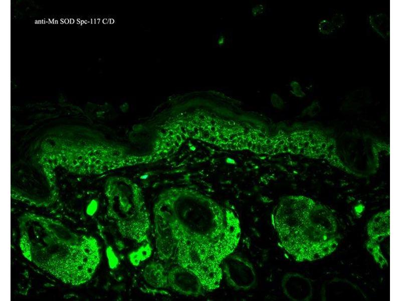 0.5 μg/ml of ABIN2484764 was sufficient for detection of Mn SOD in 20 μg of rat brain tissue extract by colorimetric immunoblot analysis using Goat anti-rabbit IgG:AP as the secondary antibody.