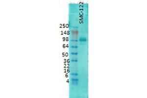 - Detects ~100 kDa. An additional protein of >100 kDa is also detected. Additional cross-reactive bands are detected at ~75 kDa and 50 kDa in rat and mouse samples.