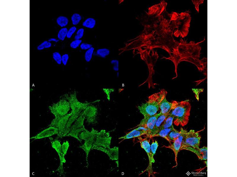 1 μg/ml of ABIN2485209 was sufficient for detection of Alpha2C Adrenergic Receptor in 20 μg of COS cells transiently transfected with HA-tagged Alpha- lysate and assayed by colorimetric immunoblot analysis using goat anti-mouse IgG:HRP as the secondary antibody.