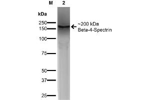 - Detects ~>200 kDa. Does not cross react with other Beta-spectrins