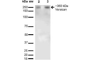 1 μg/ml of ABIN2485750 was sufficient for detection of Versican in 20 μg of mouse brain membrane lysate and assayed by colorimetric immunoblot analysis using goat anti-mouse IgG:HRP as the secondary antibody.