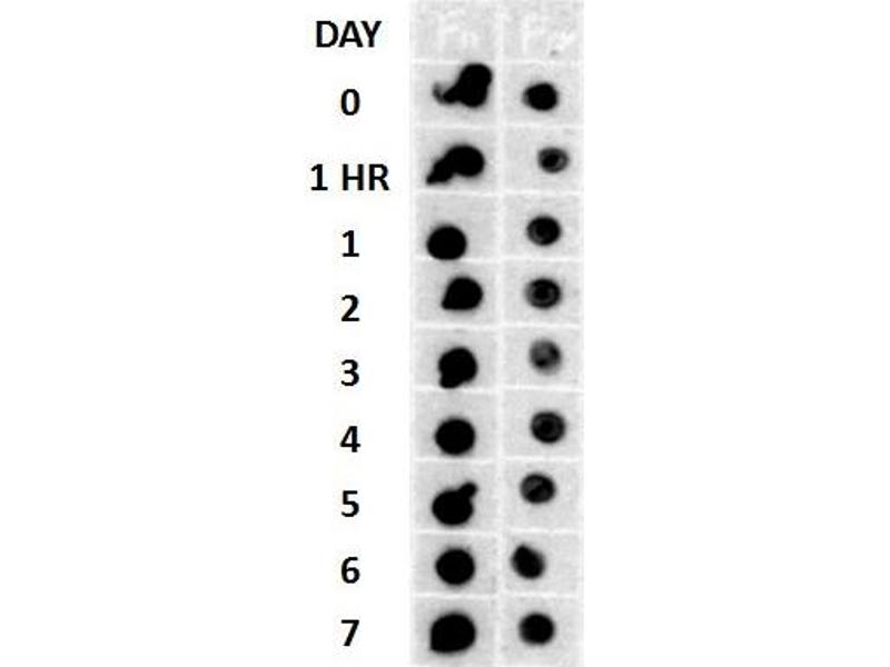 A 1:1000 dilution of ABIN2486112 was sufficient for detection of amyloid fibrils on PVDF membranes using transferred fibrils by colorimetric dot blot analysis using Goat anti-rabbit IgG:HRP as the secondary antibody.