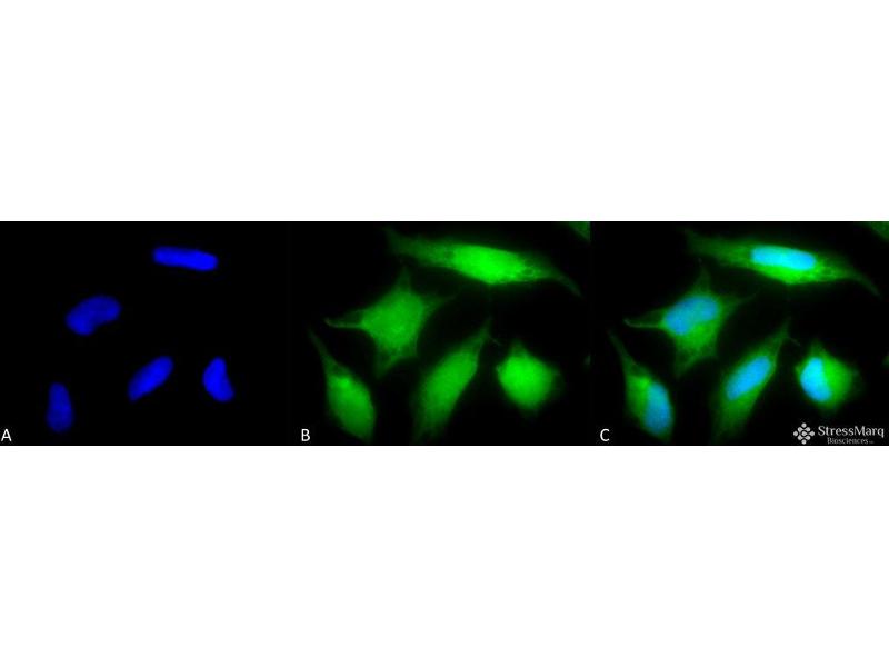 1 μl/ml of ABIN2486166 was sufficient for detection of Rab5 in 15 μg of HeLa lysate by ECL immunoblot analysis using Donkey anti-rabbit IgG:HRP as the secondary antibody.