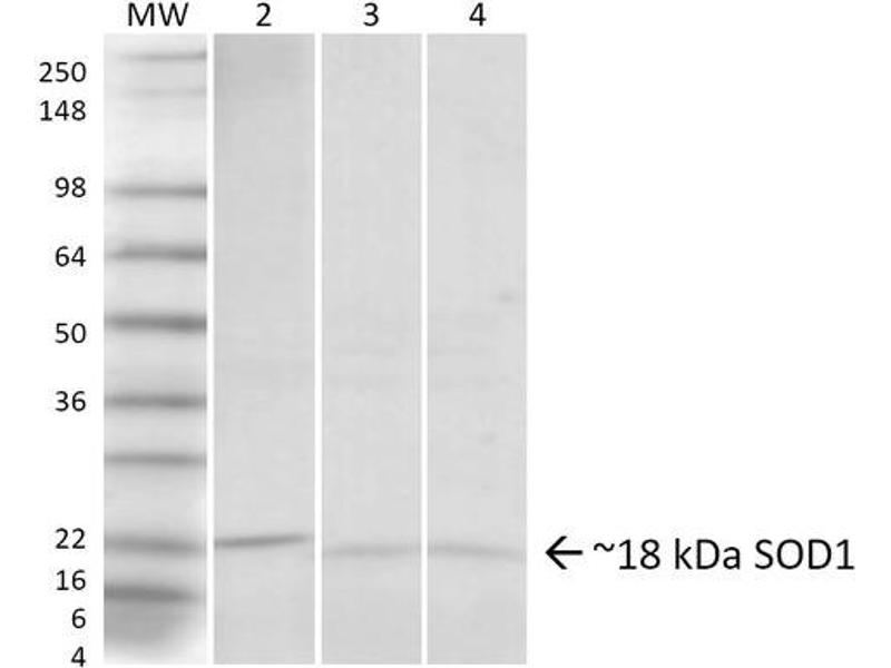 - Superoxide dismutase (SOD) is an endogenously produced intracellular enzyme present in almost every cell in the body (2). It works by catalyzing the dismutation of the superoxide radical O2ˉ to O2 and H2O2, which are then metabolized to H2O and O2 by catalase and glutathione peroxidase (1,4). In general, SODs play a major role in antioxidant defense mechanisms (3). There are two main types of SOD in mammalian cells. One form (SOD1) contains Cu and Zn ions as a homodimer and exists in the cytoplasm. The two subunits of 16 kDa each are linked by two cysteines forming an intra-subunit disulphide bridge (2). Misfolding of SOD1 has been implicated in Amyotrophic lateral sclerosis (ALS). Therefore conformation specific antibodies such as Anti-SOD1 (UbetaB), which targets an unfolded region of the beta barrel of SOD1, are useful for determining the conformation of SOD1 in affected tissues (5). This antibody can be used in conjunction with Anti-SOD1 (EDI) (SPC-206D) which detects an exposed dimer interface (EDI) of SOD1.