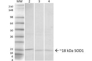 1μg/ml of ABIN2486244 was sufficient for detection of the unfolded beta barrel of SOD1 by colorimetric dot blot analysis using Goat anti-rabbit IgG:HRP as the secondary antibody.