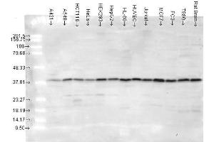 A 1:1000 dilution of ABIN2486602 was sufficient for detection of p38 in 20 μg of HeLa cell lysate by ECL immunoblot analysis.