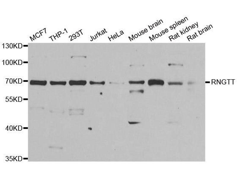 This Rabbit Polyclonal antibody specifically detects RNGTT in WB and IHC. It exhibits reactivity toward Human, Mouse and Rat.
