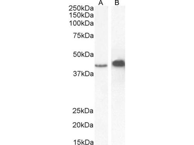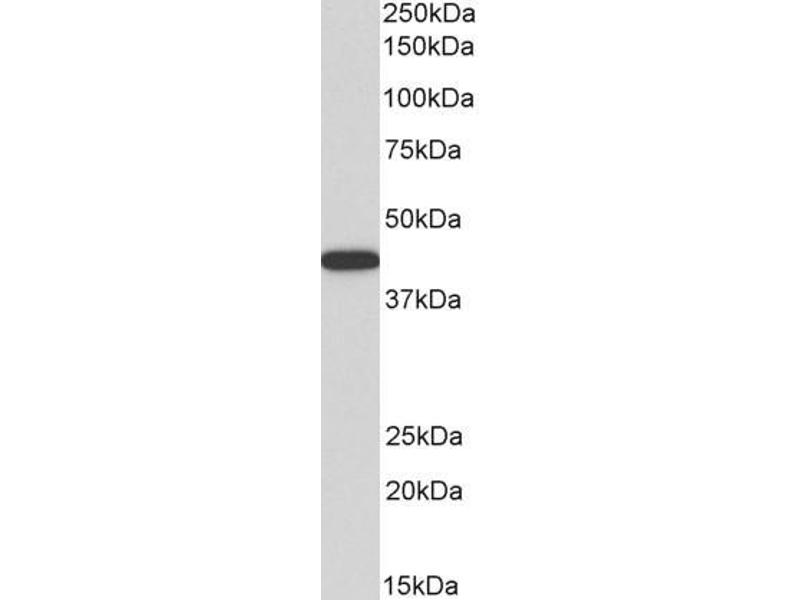 Western Blot: pprox 40-42 kDa band observed in Human Kidney and Liver lysates, and in lysates of cell line CaCo-2 and approx 40-45 kDa band observed in lysates of cell line LNCaP (calculated MW of 42.4 kDa according to NP_055139.4) and 43.9 kDa according to