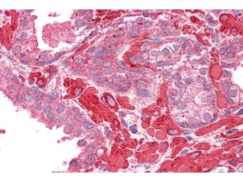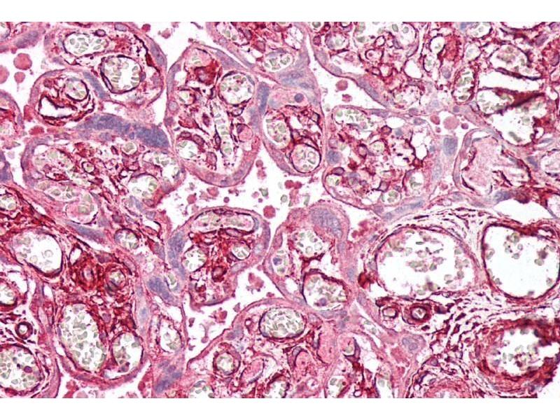 Immunohistochemistry: Paraffin embedded Human Placenta and Prostate. Recommended concentration: 2.5 μg/mL.