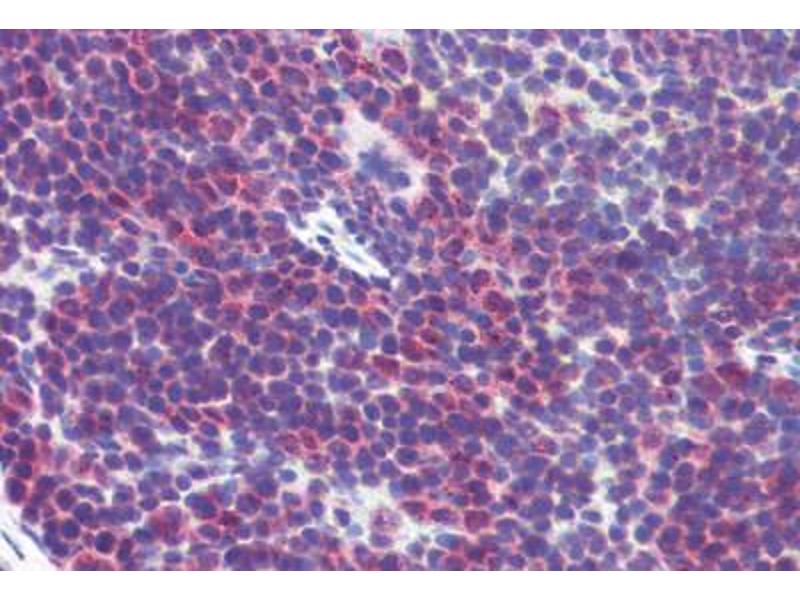 Immunohistochemistry: LS-B1590 was validated for use in immunohistochemistry on a panel of 21 formalin-fixed, paraffin-embedded (FFPE) human tissues and a panel of mouse tissues after heat induced antigen retrieval in pH 6.0 citrate buffer. After incubation with the primary antibody, slides were incubated with biotinylated secondary antibody, followed by alkaline phosphatase-streptavidin and chromogen. The stained slides were evaluated by a pathologist to confirm staining specificity. The optimal working concentration for LS-B1590 was determined to be 5 μg/mL. -