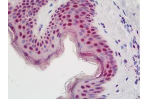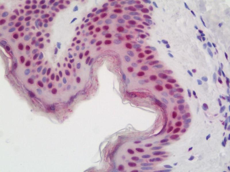 Usage: Immunohistochemistry: Antigen retrieval is recommended. Antigen retrieval with citrate buffer will enhance staining. Likely to work with frozen sections. In some cases, the antibody may be diluted further than indicated. Human controls: Breast Carcinoma, Colon Carcinoma, Prostate Carcinoma, Small Cell Lung Cancer. Mouse controls: Squamous Cell Carcinoma. -