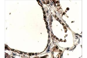 Immunohistochemistry: In paraffin embedded Human Thyroid shows staining of membranes in epithelial cells of the gland. Recommended concentration, 4-6 μg/mL.