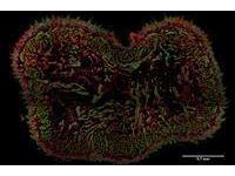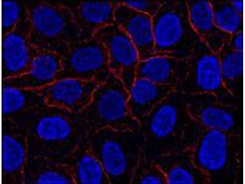 The antibody reacts with AHNAK1, a 700 kDa multi-functional adaptor protein expressed mainly in epithelial cell, various types of muscle cells and immune cells.