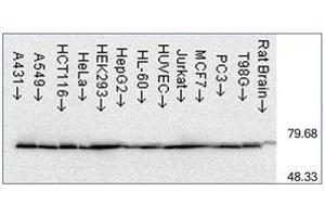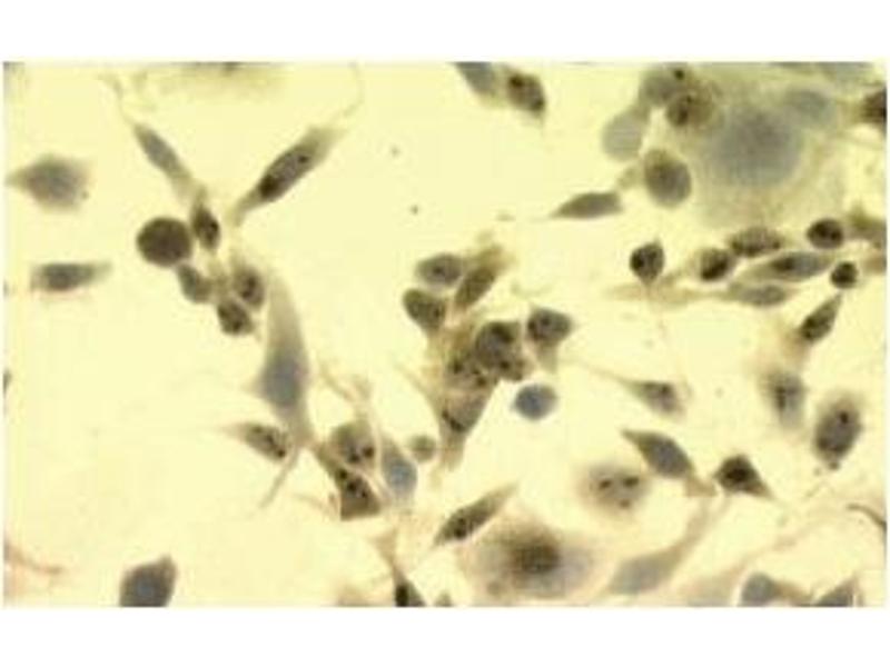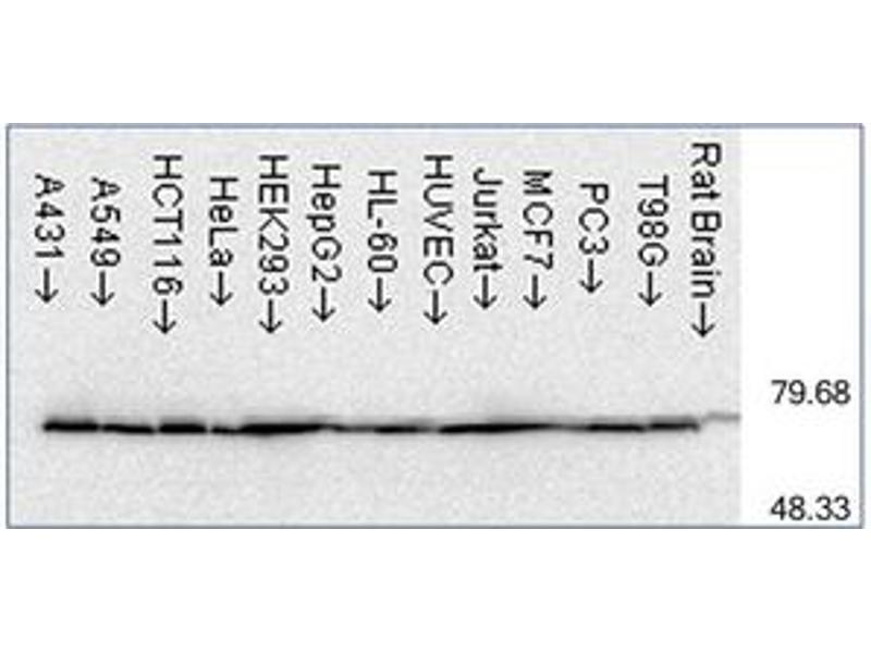 - Hsp70 genes encode abundant heat-inducible 70- kDa hsps (hsp70s). In most eukaryotes hsp70 genes exist as part of a multigene family. They are found in most cellular compartments of eukaryotes including nuclei, mitochondria, chloroplasts, the endoplasmic reticulum and the cytosol, as well as in bacteria. The genes show a high degree of conservation, having at least 5O% identity (2). The N-terminal two thirds of hsp70s are more conserved than the C-terminal third. Hsp70 binds ATP with high affinity and possesses a weak ATPase activity which can be stimulated by binding to unfolded proteins and synthetic peptides (3). When hsc70 (constitutively expressed) present in mammalian cells was truncated, ATP binding activity was found to reside in an N-terminal fragment of 44 kDa which lacked peptide binding capacity. Polypeptide binding ability therefore resided within the Cterminal half (4). The structure of this ATP binding domain displays multiple features of nucleotide binding proteins (5). All hsp70s, regardless of location, bind proteins, particularly unfolded ones. The molecular chaperones of the hsp70 family recognize and bind to nascent polypeptide chains as well as partially folded intermediates of proteins preventing their aggregation and misfolding. The binding of ATP triggers a critical conformational change leading to the release of the bound substrate protein (6). The universal ability of hsp70s to undergo cycles of binding to and release from hydrophobic stretches of partially unfolded proteins determines their role in a great variety of vital intracellular functions such as protein synthesis, protein folding and oligomerization and protein transport.Synonyms: HSP70-1/HSP70-2, HSP70.1, HSPA1, HSPA1A, HSPA1B, Heat shock 70 kDa protein 1A/1B