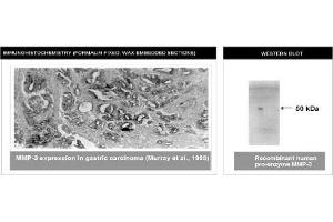The matrix metalloproteinases (MMP) are a family of peptidase enzymes responsible for the degradation of extracellular matrix components, including Collagen, gelatin, Fibronectin, Laminin and proteoglycan. Transcription of MMP genes is differentially activated by phorbol ester, lipopolysaccharide (LPS) or staphylococcal enterotoxin B (SEB). MMP catalysis requires both calcium and zinc. MMP-3, MMP-10 and MMP-11 (also designated stromelysin-1, 2 and 3, respectively) activate procollagenase. MMP-3 activation of procollagenase can occur via two pathways. Direct activation by MMP-3 is slow and activation by MMP-3 in conjunction with tissue or plasma proteinases is rapid. MMP-10 is expressed in small intestine, and at lower levels in lung and heart. MMP-11 is specifically expressed in stromal cells of breast carcinomas and contributes to epithelial cell malignancies.Synonyms: MMP3, Matrix metalloproteinase-3, SL-1, STMY1, Stromelysin-1, Transin-1