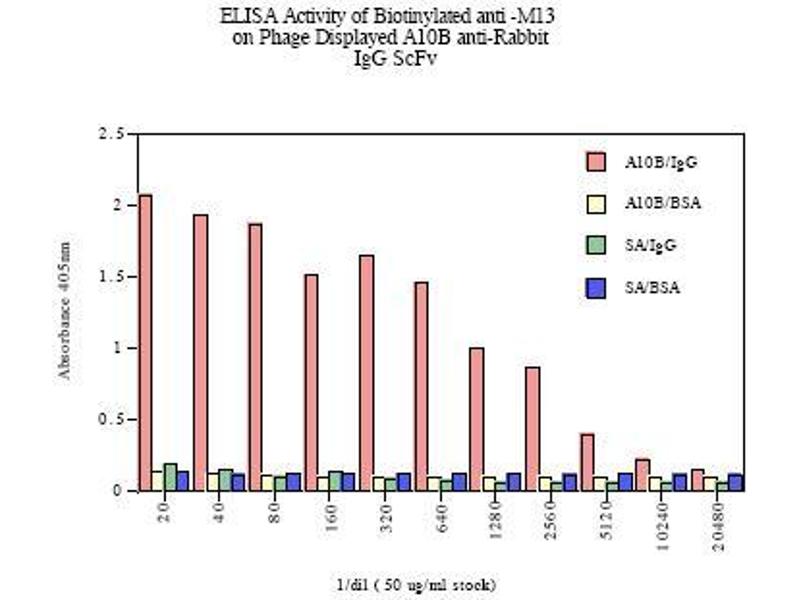 - The display of repertoires of antibody fragments on the surface of filamentous phage offers a new way to produce immunoreagents with defined specificities. Phage derived antibody fragments offer a number of advantages over mouse monoclonal antibodies, such as better clearance from the blood, the possibility to select from human combinatorial libraries and the relative ease by which such fragments can be manipulated. The phage display technique thus facilitates the selection of antibody fragments of therapeutic value or research interest. Antibodies to M13 filamentous phage coat proteins are instrumental in the selection and detection of phages expressing specific antibody fragments or peptide sequences at their surface.Synonyms: Attachment protein G3P, Gene 3 protein, Minor coat protein A