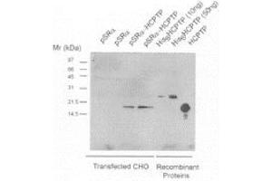 Low molecular weight protein tyrosine phosphtases, including the human red cell phosphatase, HCPTP, are widely expressed cytosolic proteins of approximately 18 kDa that exist in distinct isoforms and are highly selective for phosphotyrosine over phosphoserine or phosphotyrosine. The HCPTP-A and HCPTP-B proteins expressed in human red cells and placenta are fast and slow forms of red cell acid phosphatase5. Like other tyrosine phosphatases, HCPTP is sensitive to inhibition by vanadate, and has a catalytic mechanism that involves formation of a cystinylphosphate intermediate6. The crystal structure of the bovine heart derived enzyme BHPTP shows a four-stranded central parallel b sheet with flanking a helices and an active site cysteine residue in the typical tyrosine phosphatase sequence context, CXXXXXR. Biological actions and cellular substrates have not been fully elucidated. It is expressed in a wide range of cell types, and structural homologues are expressed in yeast. A catalytically inactive LMW-PTP functions to promote cell division and binds to tyrosine-phosphorylated PDGF receptors1. The HCPTPA isoform interacts with receptor tyrosine kinases, EphB1 and VEGFR2 (flk-1) 2,4. Its overexpression inhibits VEGF-induced endothelial proliferation and migration, and its recruitment to EphB1 complexes is crucial to downstream signaling between EphB1 and integrins that mediate cell-matrix attachment3.Synonyms: Adipocyte acid phosphatase, HAAP, Low molecular weight cytosolic acid phosphatase, Low molecular weight phosphotyrosine protein phosphatase, Red cell acid phosphatase 1