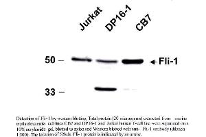 - The immunogen for the anti-murine fli-1 was a GST fusion protein corresponding to amino acid sequence 1 - 239 of the N terminus and having a molecular weight of 52 kDa. Fli-1 is a member of the ets family of transcription factors and is a proto-oncogene involved in erythroleukemia and Ewings Sarcoma.Synonyms: ERGB transcription factor, Fli-1 proto-oncogene, Friend leukemia integration 1 transcription factor, vascular tumor marker