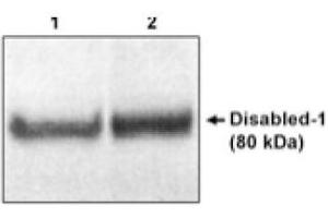 Disruption of the disabled-1 gene (Dab1) results in aberrant migration of neurons during development and disorganization of laminar structures throughout the brain. Dab1 is thought to function as an adaptor molecule in signal transduction processes. It contains a protein-protein interaction (PI) similar to the phosphotyrosine binding domain of the Shc oncoprotein, it is phosphorylated by the Src protein tyrosine kinase, and it binds to SH2 binding domains in a phosphotyrosine dependent manner. Disabled-1 acts downstream of reelin in a signalling pathway.Synonyms: Disabled homolog 1