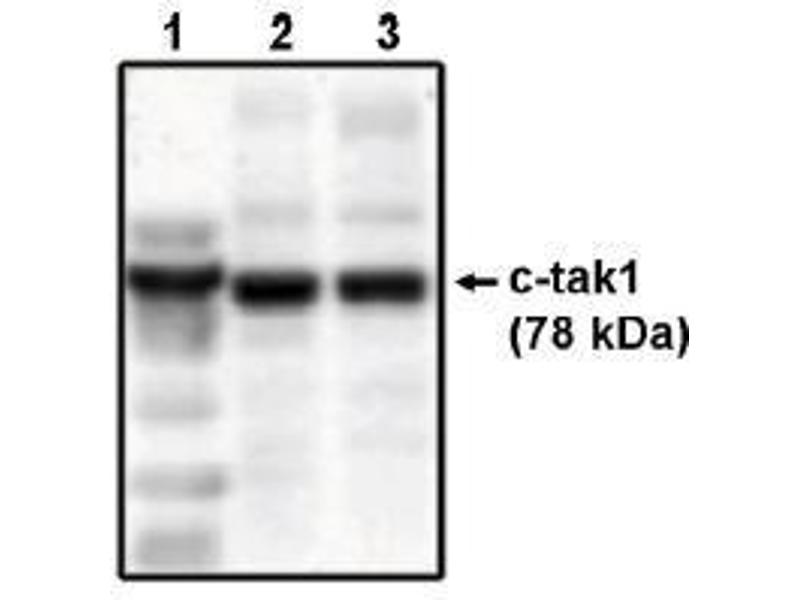 Western Blot: 1 to 5 μg/mL. Detects c-tak1 in RKO and HCT116 cell lysatesPOSITIVE CONTROL: Recombinant His-tagged C-TAK1 protein. Other applications not tested. Optimal dilutions are dependent on conditions and should be determined by the user.
