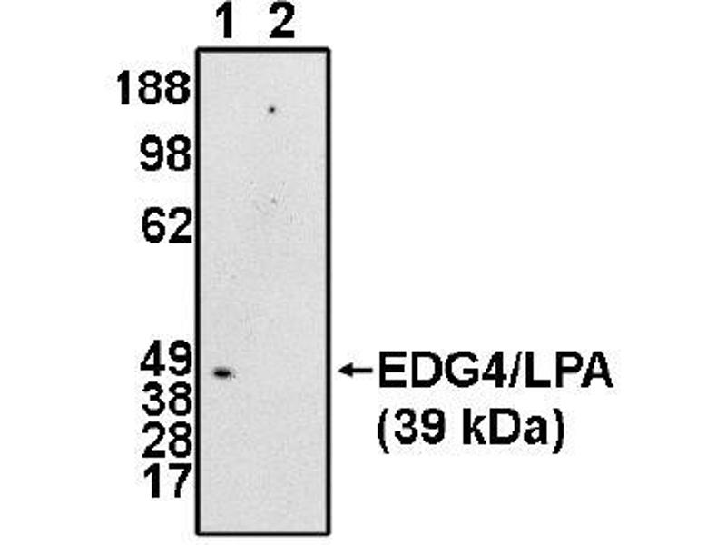 EDG4 belongs to a family of G-protein coupled receptors whose ligands are lysophospholipids. The ligand for EDG4 is lysophospholipid. There are 6 known members of the EDG receptor family and they are implicated in mediating growthrelated effects such as induction of cellular proliferation, alterations in differentiation and survival and suppression of apoptosis. They also evoke cellular effector functions that are dependent on cytoskeletal responses such as contraction, secretion, adhesion and chemotaxis. EDG receptors are developmentally regulated and differ in tissue distribution. They couple to multiple types of G proteins to signal through ras and MAP kinase, rho, phospholipase C and several protein tyrosine kinases. EDG4 is expressed in testes, ovarian tumor and leukocyte containing tissues.Synonyms: EDG4, Ipa-2, LPAR2, Lysophosphatidic acid receptor 2, Lysophosphatidic acid receptor Edg-4, endothelial differentiation, lysophosphatidic acid G-protein-coupled receptor 4