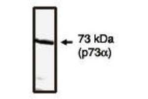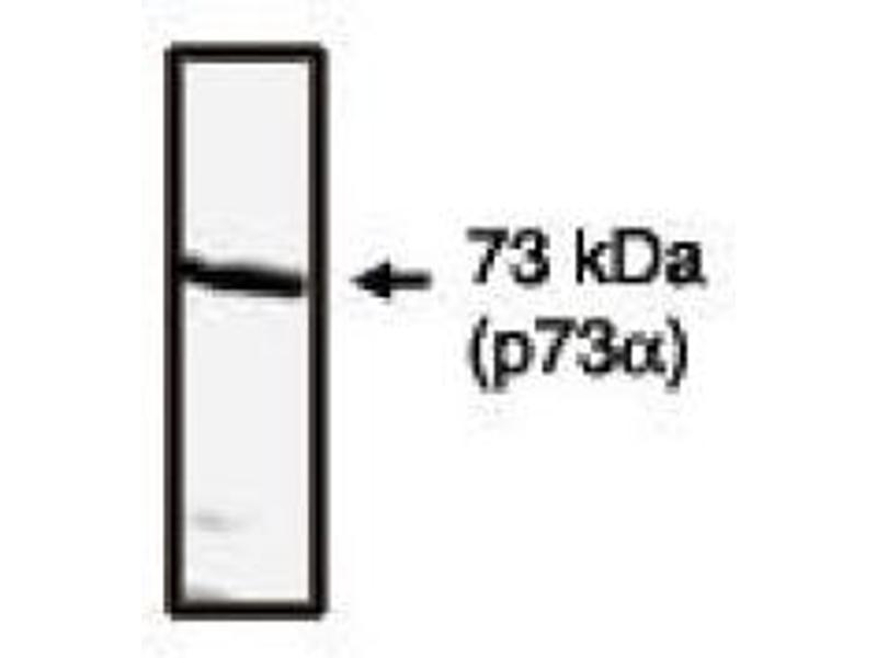 P73 protein is a member of the p53 family of proteins. The tumor-suppressor protein p53 exhibits sequence specific DNA binding, directly interacts with various cellular and viral proteins, and induces cell cycle arrest in response to DNA damage. In response to signals generated by a variety of genotoxic stresses, e.g, UV irradiation or DNA damage, p53 is expressed and undergoes post translational modification that results in its accumulation in the nucleus. Activation of p53 leads to cell cycle arrest and in some cases to apoptosis, resulting in the inability of genetically damaged cells to proliferate. Thus, the p53 dependent pathways help to maintain genomic stability by eliminating damaged cells. The accumulation of high levels of p53 is a potential marker for malignancy. p73 protein is expressed in either full length form (p73 alpha 80 kDa) or a shorter (p73 beta 70 kDa) mRNA variant. p73 gene was predicted to encode a protein with significant amino acid sequence similarity to p53. Each of the p53 amino acid residues implicated in direct sequence specific DNA binding is conserved in p73. p73 can activate the transcription of p53 responsive genes and inhibit cell growth in a p53 like manner by inducing apoptosis and cell cycle arrest. p73 has been mapped at chromosome 1p36.3, which is a locus of multiple suppressor genes for tumors including neuroblastoma and other cancers. c-Abl stimulates p73 mediated transactivation and apoptosis. This regulation of p73 by c-Abl in response to DNA damage was also demonstrated by a failure of ionizing radiation induced apoptosis after disruption of c-Abl-p73 interaction. The p73 protein can activate p53 responsive promoters and induce apoptosis in cells deficient in p53, which proves that inactivation of p53 family members may contribute to the biological properties of a subset of p53 mutants. The transcriptional activities of p53, p73 alpha, and p73 beta to induce their common cellular target genes differ among one another. Despite the high degree of similarity between p53 and p73, adenovirus E1B 55K, simian virus 40 T, and human papilloma virus E6 do not physically interact with p73, indicating that the functions of these two proteins may differ.Synonyms: p53-like transcription factor, p53-related protein