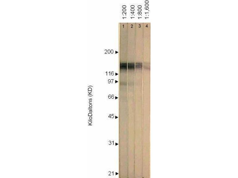Western Blotting: > 1:600. Immunofluorescence: 1+ at 1:25.600. ELISA: 0.100 at 1:26.600