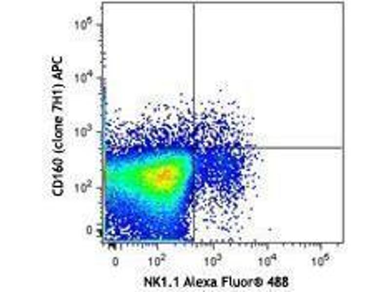 CD160, also known as BY55, is a 27 kD glycoprotein and member of the Ig superfamily. It is anchored to the cell membrane through glycosylphosphatidylinositol (GPI) and forms disulfide-linked multimers. A soluble form of CD160 is secreted by activated CD8+ T cells. Expressed by NK, NKT, γ/δ T cells, intestinal intraepithelial T cells and a subset of memory CD8+ T cells, CD160 binds both classical and non-classical MHC class I molecules. It is also a ligand for HVEM. CD160 enhances proliferation of activated CD8+ T cells and triggers cell cytotoxicity in NK cells.