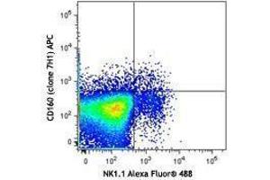 CD160, also known as BY55, is a 27 kD glycoprotein and member of the Ig superfamily. It is anchored to the cell membrane through glycosylphosphatidylinositol (GPI) and forms disulfide-linked multimers. A soluble form of CD160 is secreted by activated CD8+ T cells. Expressed by NK, NKT, γ/δ T cells, intestinal intraepithelial T cells and a subset of memory CD8+ T cells, CD160 binds both classical and non-classical MHC class I molecules. It is also a ligand for HVEM. CD160 enhances proliferation of activated CD8+ T cells and triggers cell cytotoxicity in NK cells.