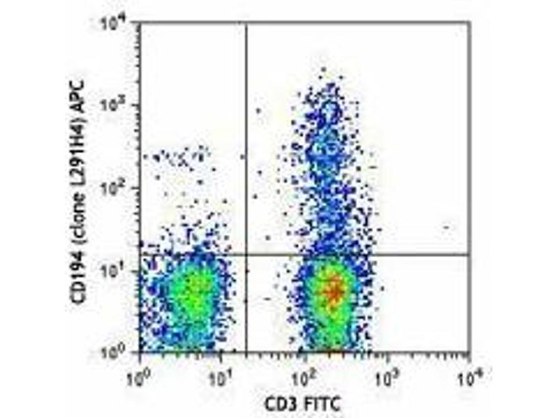 CD194, also known as CCR4, is a CC chemokine receptor. It binds CCL17 and CCL22 and is expressed on a subset of T and B cells, basophils, monocytes, and NK cells. Human Th2 cells are characterized by the expression of CCR4 and CCR8, and these receptors are regulated differently during Th2 development. Human peripheral blood Tregs can be divided into two distinct populations based on the expression of CCR4. Freshly isolated Tregs express CCR4 and presumably represent memory-type Tregs, and CCR4- Tregs require CD3-mediated activation to acquire a regulatory activity. Depletion of CCR4+ T cells leads to Th1-type polarization of CD4+ T cells and augmentation of CD8+ T cell responses to tumor antigens. CCR4 and its ligands are important for the recruitment of memory T cells into the skin in various cutaneous immune diseases.