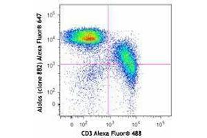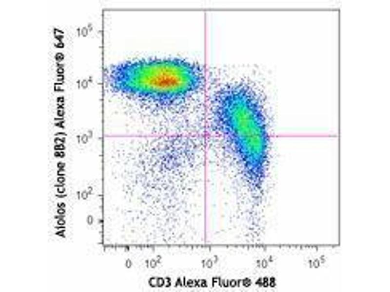Aiolos, an Ikaros family member, is also known as Izkf3. It has a molecular weight of 58 kD and shows 70 % homology to the Ikaros isoform, Ik-1, particularly in the DNA binding and C-terminal domains. Aiolos can form a heteromer with Ikaros or exist as a homodimer. The homomeric complex is a potent transcriptional activator. Unlike Ikaros, Aiolos is expressed in late fetal thymus and adult lymphoid organs. Among the adult hematopoietic progenitors, Aiolos is expressed at low levels in mulitpotent but not in pluripotent stem cells. When these multipotent progenitors become more restricted to T and B lymphoid pathways there is an upregulation in Aiolos expression. The highest expression of Aiolos is detected in the spleen (especially in B-cells) followed by thymus and bone marrow, and cannot be detected in the non-lymphoid organs. Aiolos plays an important role in lymphocyte proliferation and differentiation.