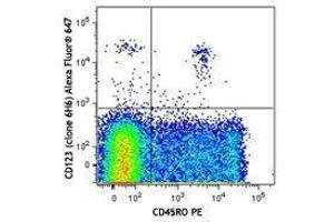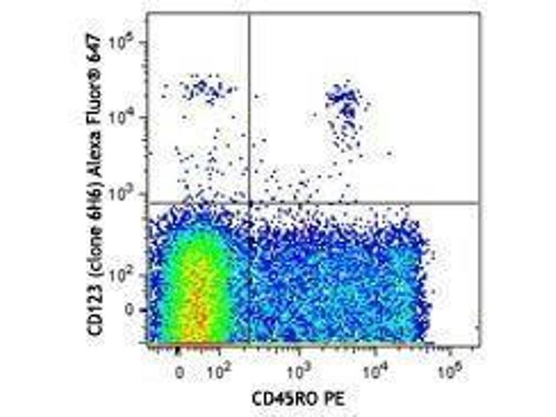 CD123 is the 70 kD transmembrane α chain of the IL-3 receptor. Alone, CD123 binds IL-3 with low affinity, when CD123 associates with CDw131 (common β chain), it binds IL-3 with high affinity. CD123 does not transduce intracellular signals upon binding IL-3 and requires the β chain for this function. CD123 is expressed by myeloid precursors, macrophages, dendritic cells, mast cells, basophils, megakaryocytes, and some B cells.