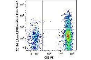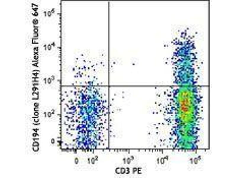 CD194, also known as CCR4, is a CC chemokine receptor. It binds CCL17 and CCL22 and is expressed on a subset of T and B cells, basophils, monocytes, and NK cells. Human Th2 cells are characterized by the expression of CCR4 and CCR8, and these receptors are regulated differently during Th2 development. Human peripheral blood Tregs can be divided into two distinct populations based on the expression of CCR4. Freshly isolated Tregs express CCR4 and presumably represent memory-type Tregs, and CCR4- Tregs require CD3-mediated activation to acquire a regulatory activity. Depletion of CCR4+ T cells leads to Th1-type polarization of CD4+ T cells and augmentation of CD8+ T cell responses to tumor antigens. CCR4 and its ligands are important for the recruitment of memory T cells into the skin in various cutaneous immune diseases.