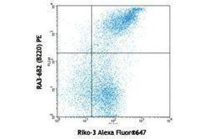 CD55, also known as DAF (decay accelerating factor), is expressed on the surfaces of red blood cells, hematopoietic cells and many non-hemotopietic cells. There are two isoforms of mouse CD55, a GPI-anchored isofrom and a transmembrane isoform. Both are recognized by RIKO-3. The function of CD55 is to protect damage by complement deposition.
