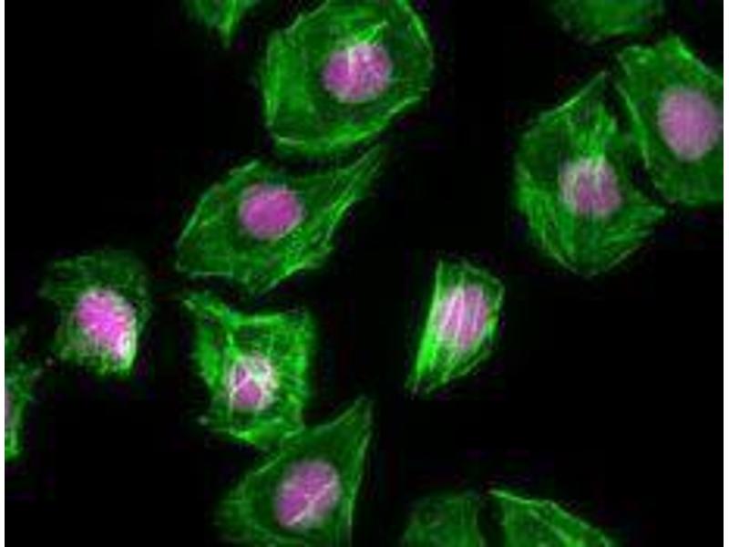 Antigen Ki-67 is a nuclear protein expressed as two isoforms with molecular weights of 395 and 345 kD. Both isoforms contain one forkhead-associated domain and 16 concatenated "Ki-67 repeats," each containing the epitope recognized by the mAb Ki-67. The antigen Ki-67 interacts with Hklp2, hNIFK, and chromobox protein homolog 1, 3, and 5. Ki-67 is required for cell proliferation and its expression is restricted to the phases G1, S, G2, and M of the cell cycle. This characteristic makes Ki-67 an excellent marker for proliferating cells and is commonly used as one of the prognostic factors in cancer studies. Ki-67 has also been used to study myocyte proliferation after myocardial infarction as well as lymphocyte proliferation during infection, and has been used in neurons of patients with different neuropathologies.